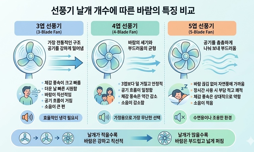 이처럼 3엽, 4엽, 5엽 선풍기를 비교해 보면 날개 개수는 바람의 절대적인 세기를 결정하기보다는 바람의 전달 방식과 체감 특성을 바꾸는 요소로 작용한다. 날개가 적을수록 바람은 강하고 직선적으로 전달되며 날개가 많을수록 바람은 부드럽고 넓게 퍼진다.