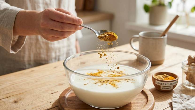 생강을 일상에서 가장 효과적으로 섭취할 수 있는 방법으로 '생강 강황 골든 밀크'를 강력하게 추천한다. 단순히 생강을 단독으로 먹는 것보다 특정 식재료와 조합했을 때 그 생물학적 이용률이 비약적으로 상승하기 때문이다. 골든 밀크를 만드는 방법은 간단하면서도 과학적이다. 따뜻한 우유에 생강가루, 강황 가루, 그리고 약간의 후추를 섞어 마시는 방식이다.