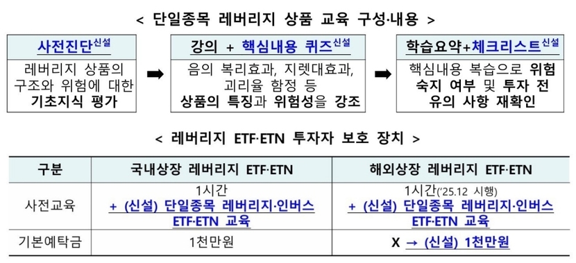 사전교육도 강화된다. 현재 국내외 레버리지 ETF와 ETN 투자자는 1시간 교육을 이수해야 하는데, 단일종목 레버리지·인버스 상품에 투자하려는 경우에는 추가로 1시간짜리 심화 교육을 더 받아야 한다. 심화 교육은 오는 28일부터 수강할 수 있으며, 음의 복리 효과와 지렛대 효과, 괴리율 위험 등 단일종목 상품의 구조적 위험을 중심으로 구성된다. 단순 강의만 듣는 방식이 아니라 사전 진단, 핵심 퀴즈, 투자 체크리스트까지 포함해 실제 이해도를 높이도록 교육 방식도 바뀐다.