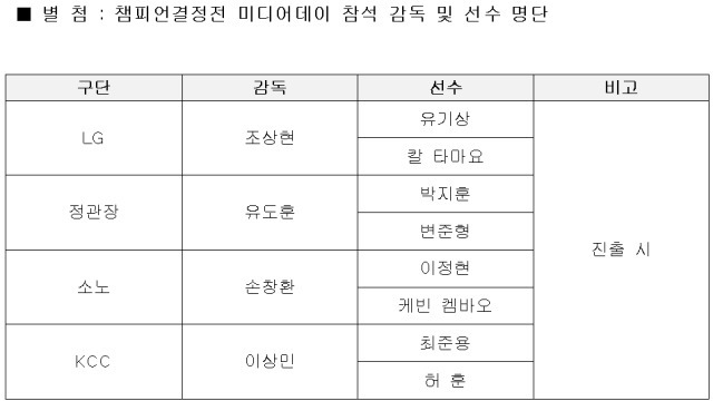 본 행사에는 양 팀 감독 및 대표 선수들이 참석해 챔피언결정전 출사표와 경기에 임하는 각오를 밝힐 예정이다. 미디어 질의에 답변하는 시간도 마련된다.