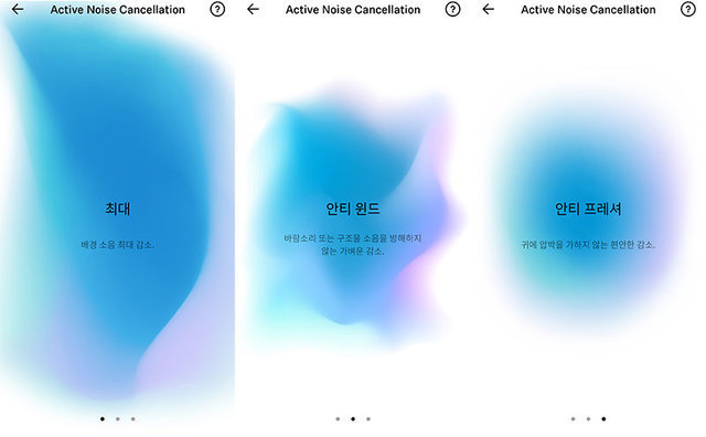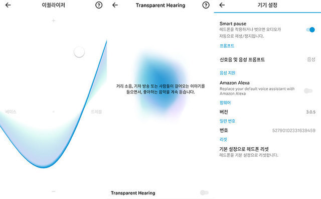 기본 설정 시에는 이 기능을 켰을 때 음악이 멈추지만, 전용 앱을 이용해 설정을 바꾸면 음악을 듣는 중에도 외부 소리를 함께 들을 수 있다. 당연한 이야기지만, 주변 소리보다 음악 소리가 크면 이 기능을 켜더라도 주변 소리를 제대로 듣기 어렵다.전용 앱에서는 몇 가지 설정을 할 수 있다. 이퀄라이저 설정의 경우 그래픽으로 된 직관적인 디자인을 적용해 고음역에서 저음역 까지 원하는 대역을 손쉽게 강화하거나 줄일 수도 있다. 또한, 앞서 언급했던 노이즈 캔슬링이나 트랜스 페어런트 히어링 기능을 어떤 식으로 적용할지도 앱 내에서 선택할 수 있으며, 헤드폰 자체에 대한 펌웨어 업데이트도 진행할 수 있다. 작동 상태에 대한 음성 안내는 다양한 언어로 선택할 수 있지만, 한국어의 경우 어색하게 번역한 상태로 들려주기 때문에 언어는 영어로 하는 것이 좋을 듯하다.