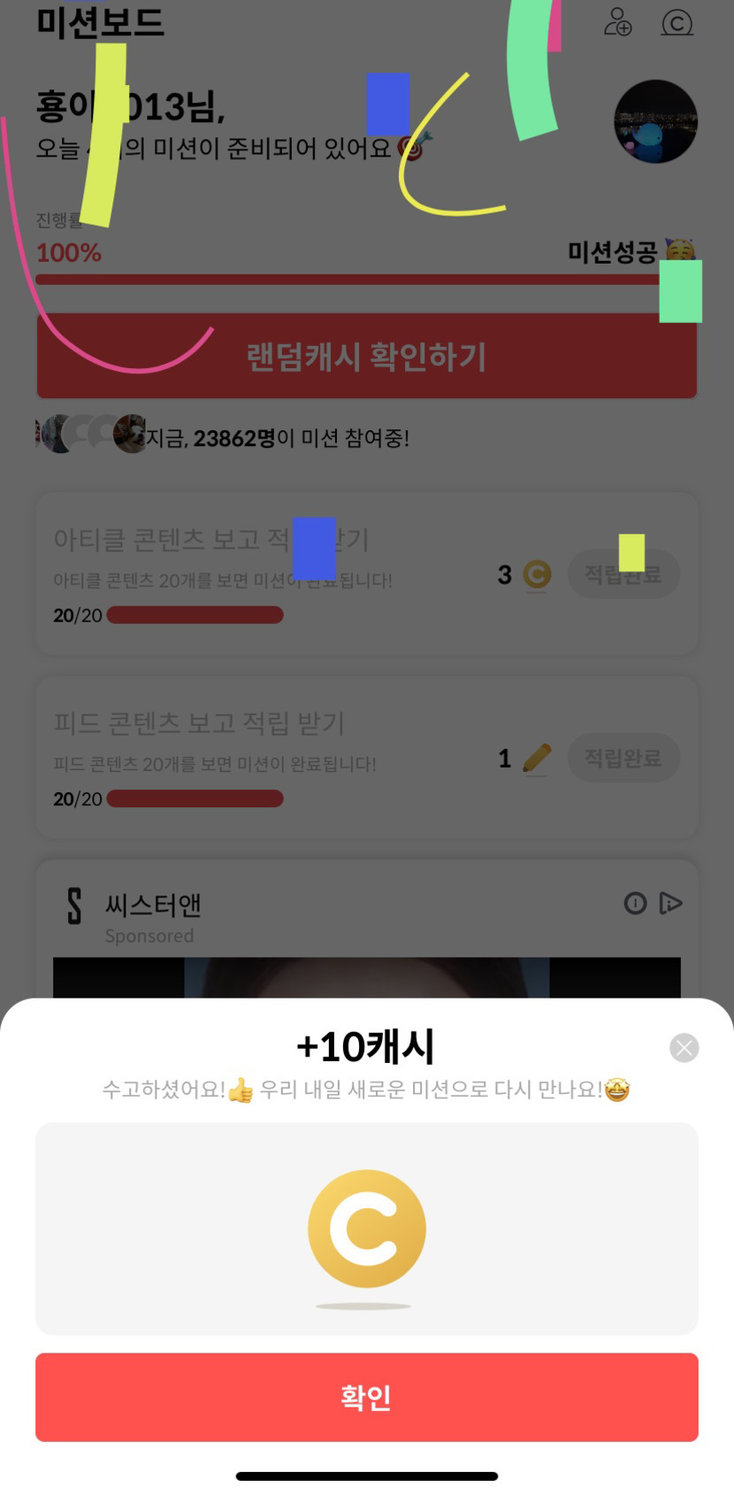 랜덤캐시하고 첨으로 10캐시 받았어요😍