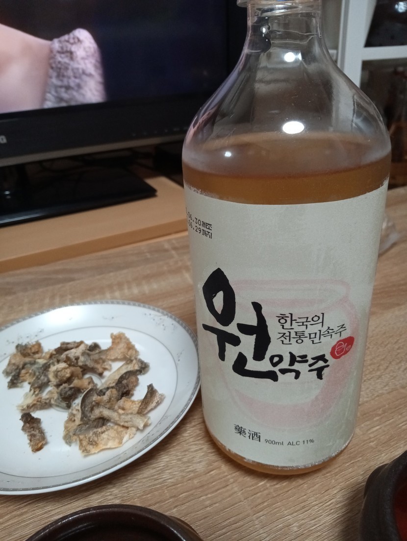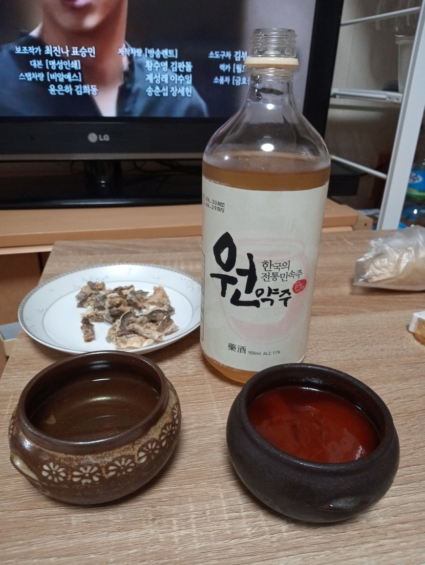 갑자기 냉동실에 있는 북어껍데기와 친구가 준 원약주!