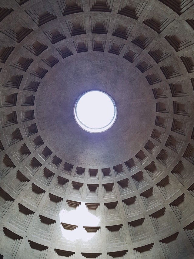 오쿨루스라 불리는 건물 천장에 구멍이 뚫린 자리는 태양을 상징한다고 합니다! 지름이 9cm인 구멍은 자연광이 들어오는 유일한 통로로 비가 많이 와도 내외부 압력 차이로 그다지 많이 들어오지 않고 설령 들어온다고 해도 아래 바닥에 구멍이 뚫린 곳으로 빠져나간다고 합니다~