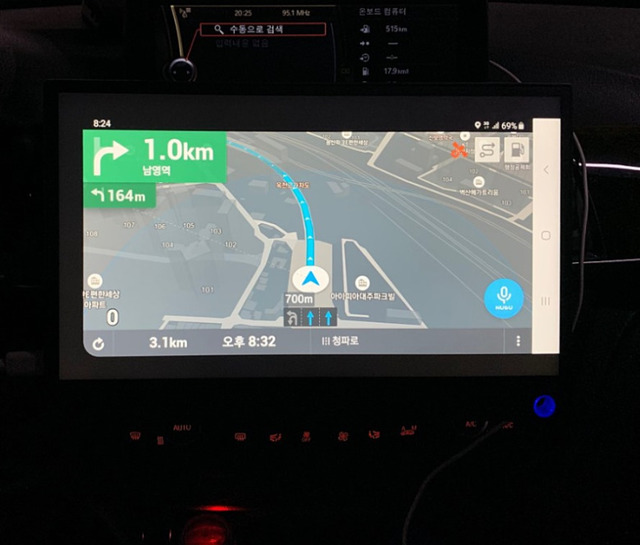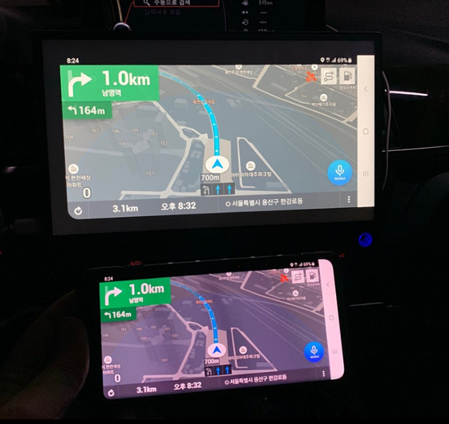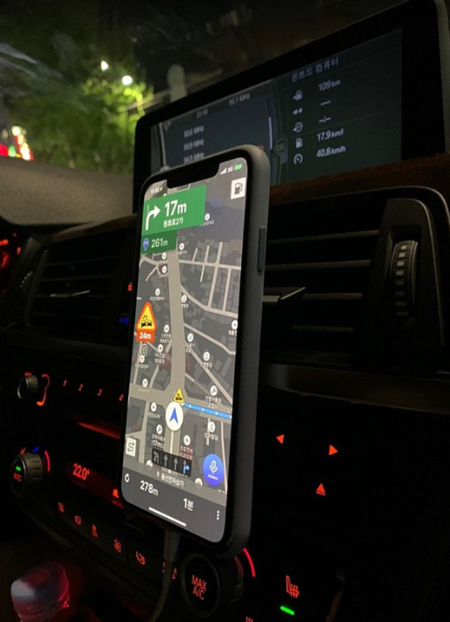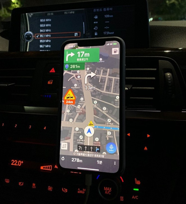 그런데 최근에 구입한 미니 모니터가 500g대인걸 알고 스마트폰과 무게를 비교해보니 (눈대중...) 별 차이가 없는 것 같아 거치대 2개를 구입해서 달아 보기로 했습니다.송풍구가 이렇게 간격이 넉넉하다는 것도 자신감을 주는데 충분했죠. 2개 걸면 되겠다 싶고 무게도 분배 될테니...2개를 간격을 벌리고 거치 상태로 만든 후 걸어 보니 잘 맞네요.미러링 해서 네비 보기 좋고 동영상 보기에도 좋구요.
