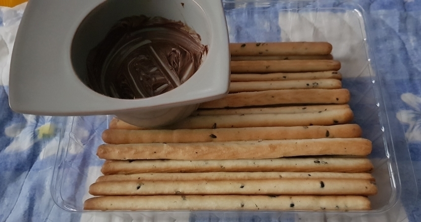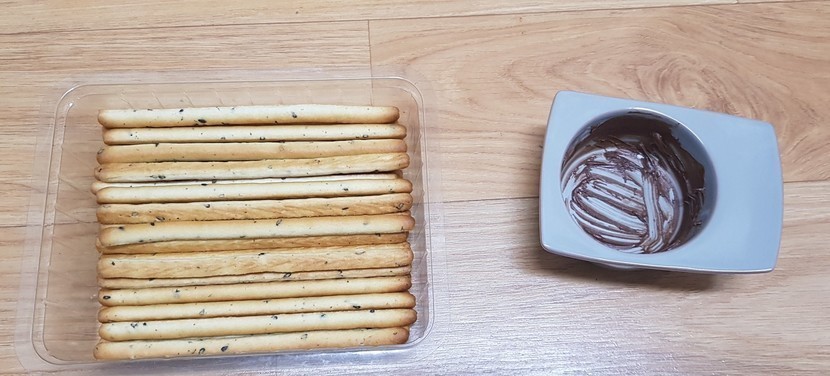 과자스틱과 초코 크림이 같이 있는 제품을