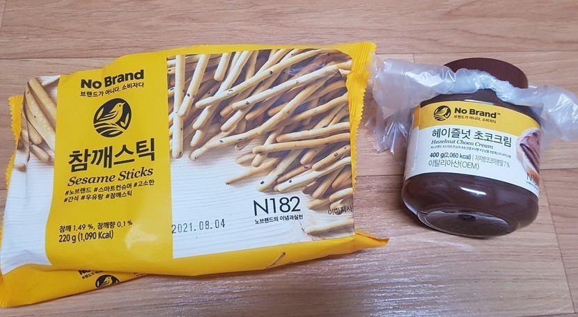 초코크림과 참깨스틱을 노브랜드에서 샀어요