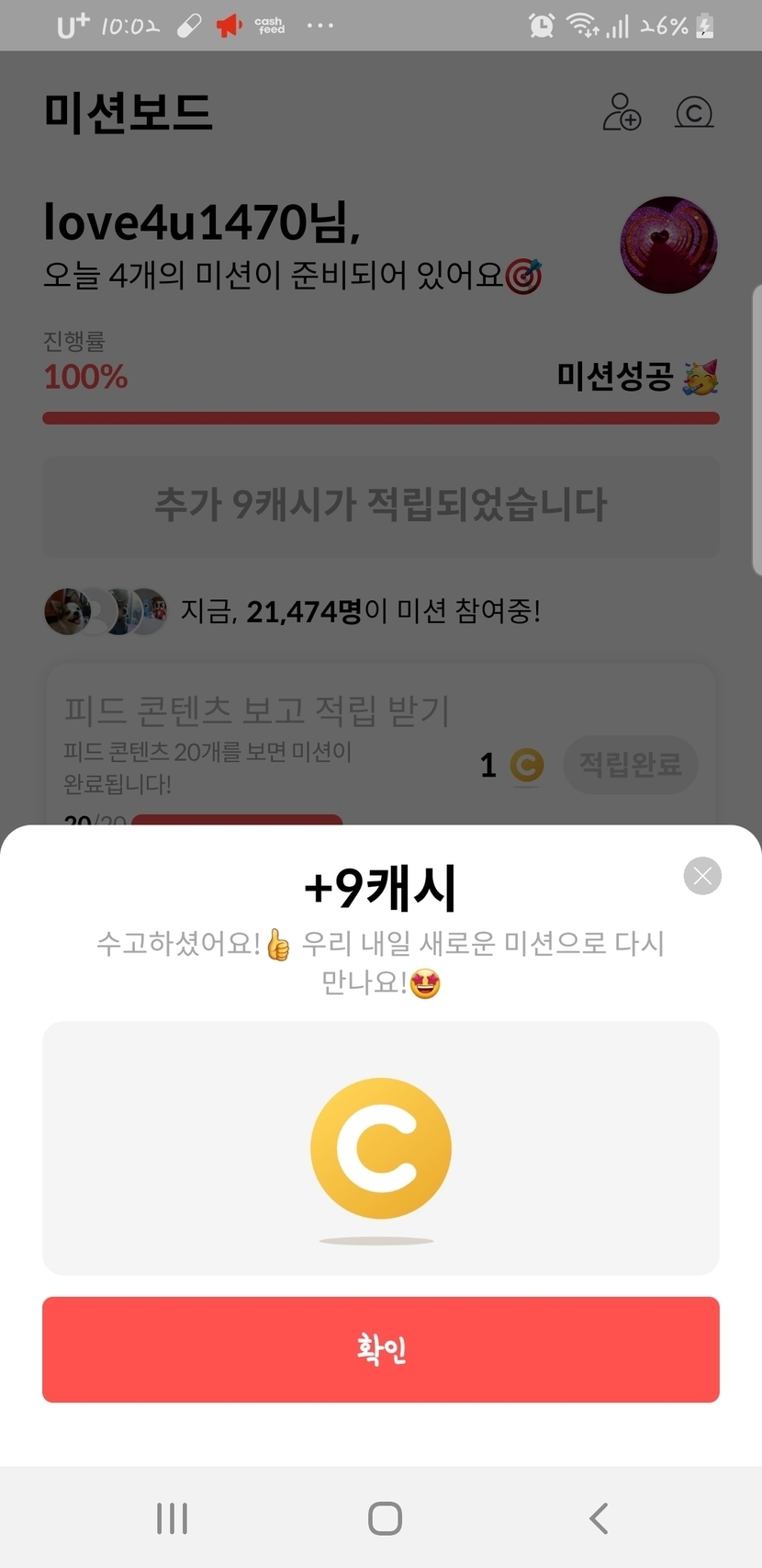 오늘 미션 성공 랜덤 캐시는