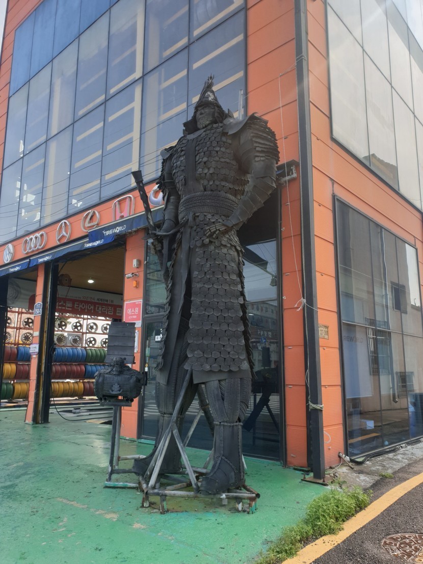 지나가는 타이어가게 앞에 세워져있는 폐타이어로 만든 장군상~