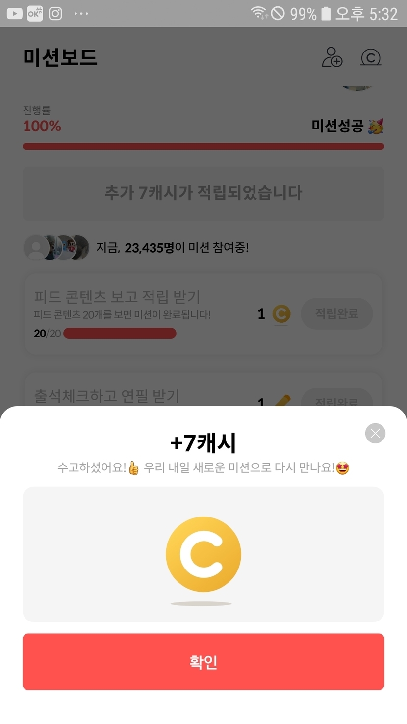 미션보드 성공하고 행운의 7캐시받았어요.