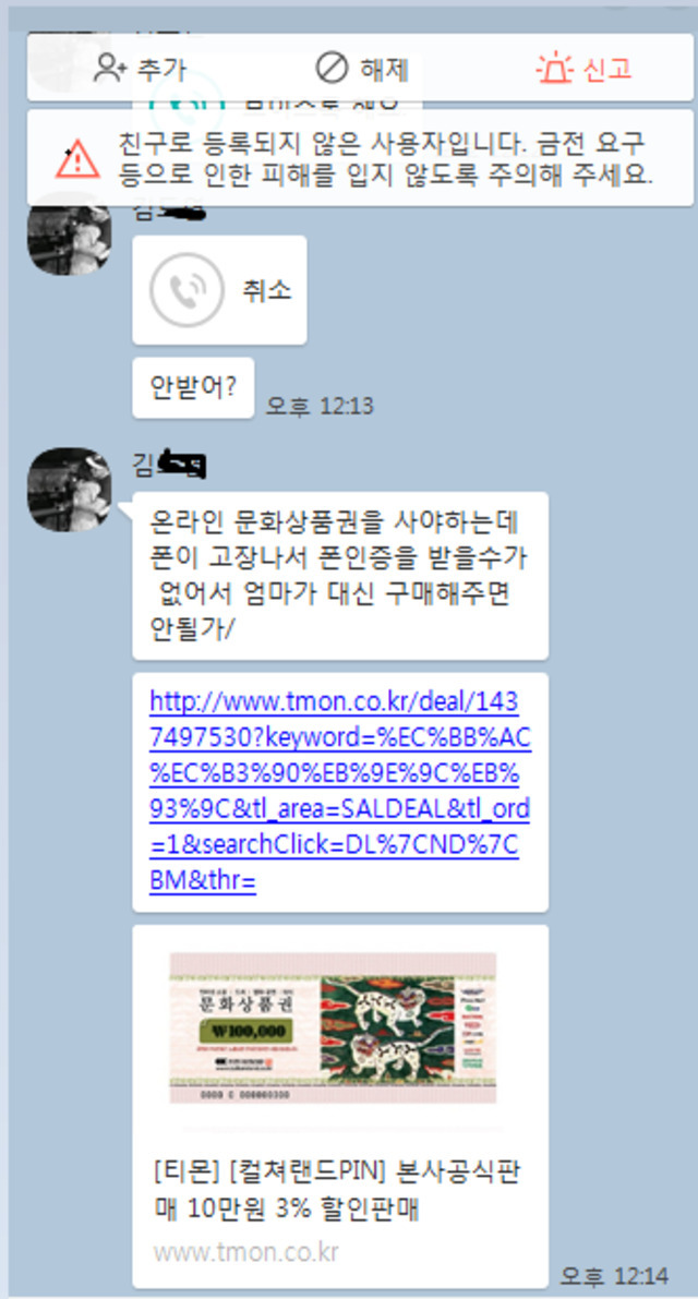 19.12.02 428 읽음 깨톡 보이스피싱 주의 아름다운동행 구독하기 7 22 콘텐츠의 수익 140 우리아이가 와국에 잠깐 나가있어 카톡으로 문자와서 봤더니 보이스피싱이네요. 프로필사진도 똑같고 차단해도 자꾸 들어오고 보이스톡까지 오네요 ㅋ 문화상품권 결제해달라고... 보시고 나같은 일 없으시길...세번째 사진이 울아이의 진짜 톡입니다. 아이의 이름도 같더라구요 ㅠㅠ항상 조심하시고 안전한 온라인 즐겼으면합니다. 아무거나 클릭 금지!!!! 22 0 / 300 입력