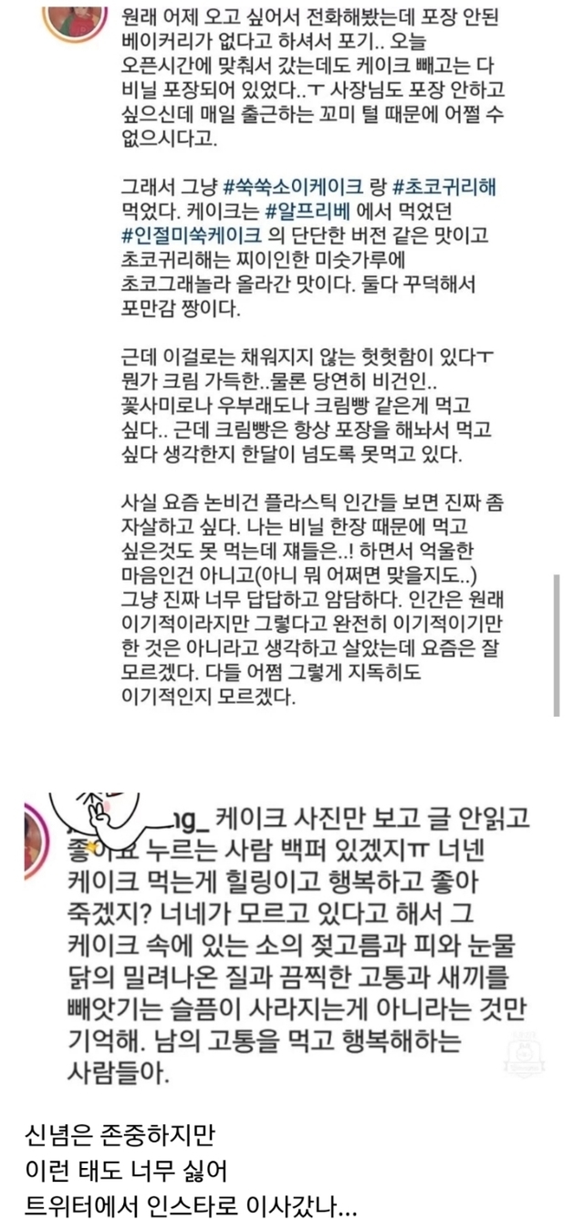 19.08.13 222 읽음 일부 비건이 싫은 이유.jpg 아아모르겠다 구독하기 0 3 콘텐츠의 수익 0 저사람 진짜 웃기다ㅋㅋㅋㅋㅋ 인스타보면 더가관임..천한거 처먹는 남들과 다르게 고귀한 비건하는 나 자신에 취한 느낌ㅋㅋㅋㅋ 하이고 3 0 / 300 입력