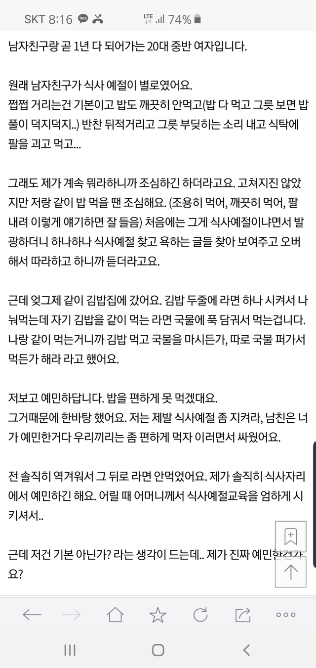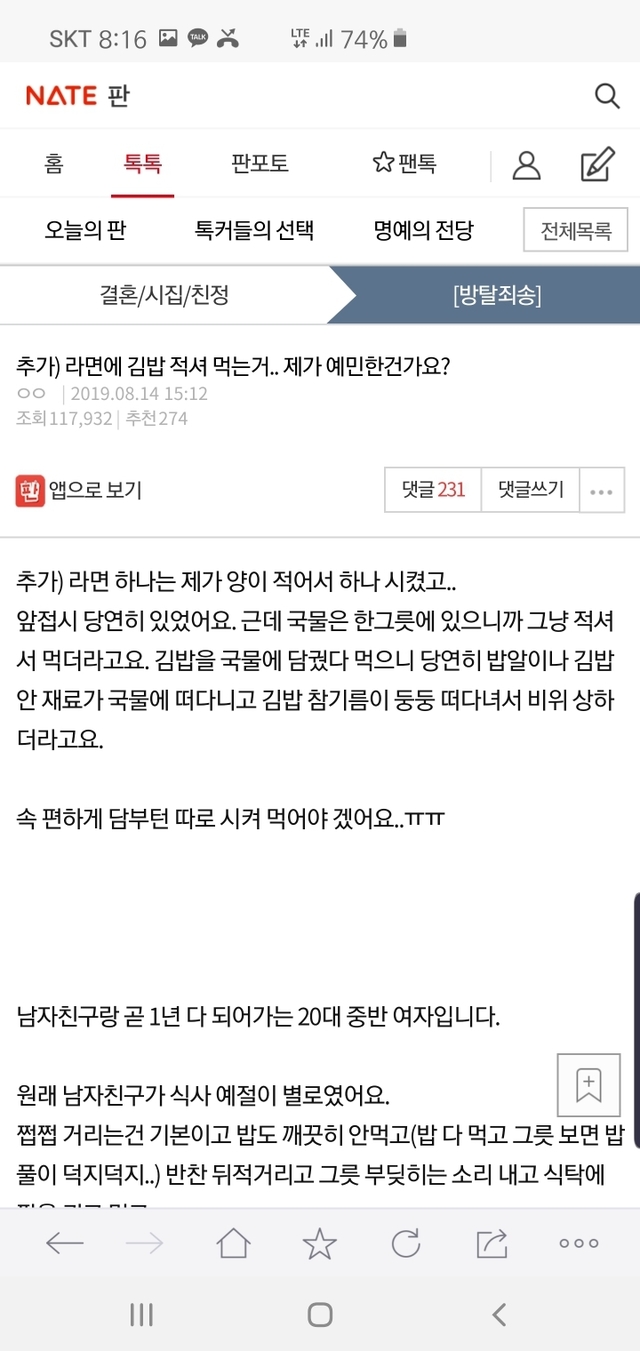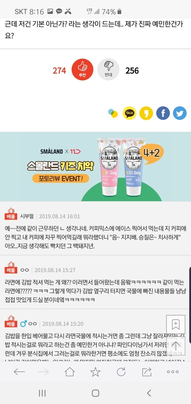 라면에 김밥 적셔 먹는거.. 제가 예민한건가요?