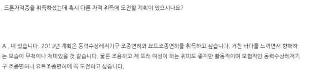" 사실 자격증이 없어도 드론은 날릴 수 있다. 비행 금지 구역 같은 데만 잘 알고 있으면 상관이 없는데, 사업적으로 쓰려면 꼭 자격증을 따야 한다. 그냥 막 하는 것이 아니라 공부할 것도 많고, 외울 것도 많다. 자격증이 있으면 페스티벌 같은 데 가서도 드론을 날릴 수 있고, 연예인이 주체가 되면 큰 이슈가 될 수 있다고 생각했다. 농약도 칠 수 있다. 봉사 활동도 할 수 있고. 이제는 드론 교관 자격증까지 노리고 있다. 그리고 경비행기 조종 자격증도 언젠가 꼭 따려고 한다.”