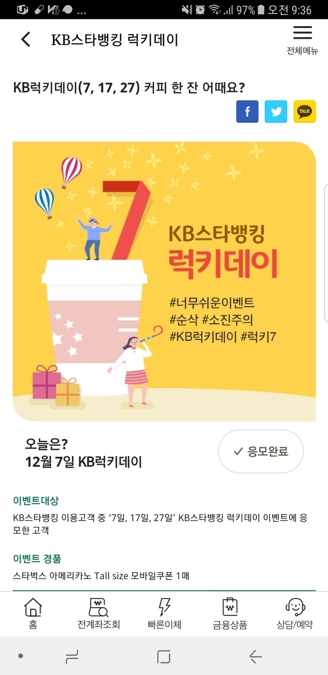 19.12.07 29 읽음 국민 이용하시는분들은 응모해보세요~스타벅스 준대요~ kshhkj 구독하기 0 1 콘텐츠의 수익 15 국민 뱅킹 이용하시는분들 이벤트 응모해보세요~7일,17일,27일 응모하는 이벤트래요~당첨되면 스타벅스 준대요^^따뜻한 겨울에 한잔들 하세요~모두 즐거운 주말보내세요~~ 1 0 / 300 입력