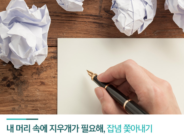 이럴 때는 머리 속에 떠도는 생각들을 종이에 적는 것이 효과적입니다. 생각들을 글로 적으면서 머리 밖으로 나간 덕분에 뇌는 새로운 일을 할 준비가 됩니다.