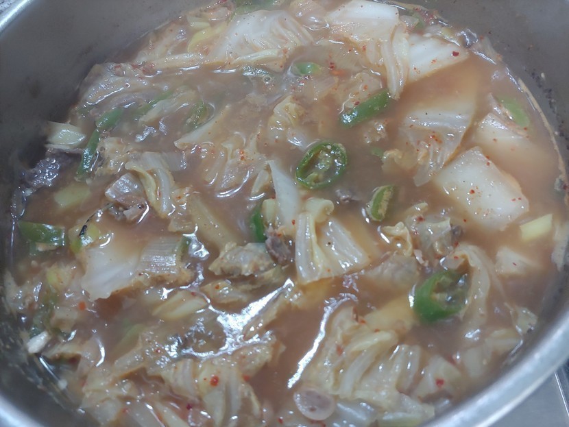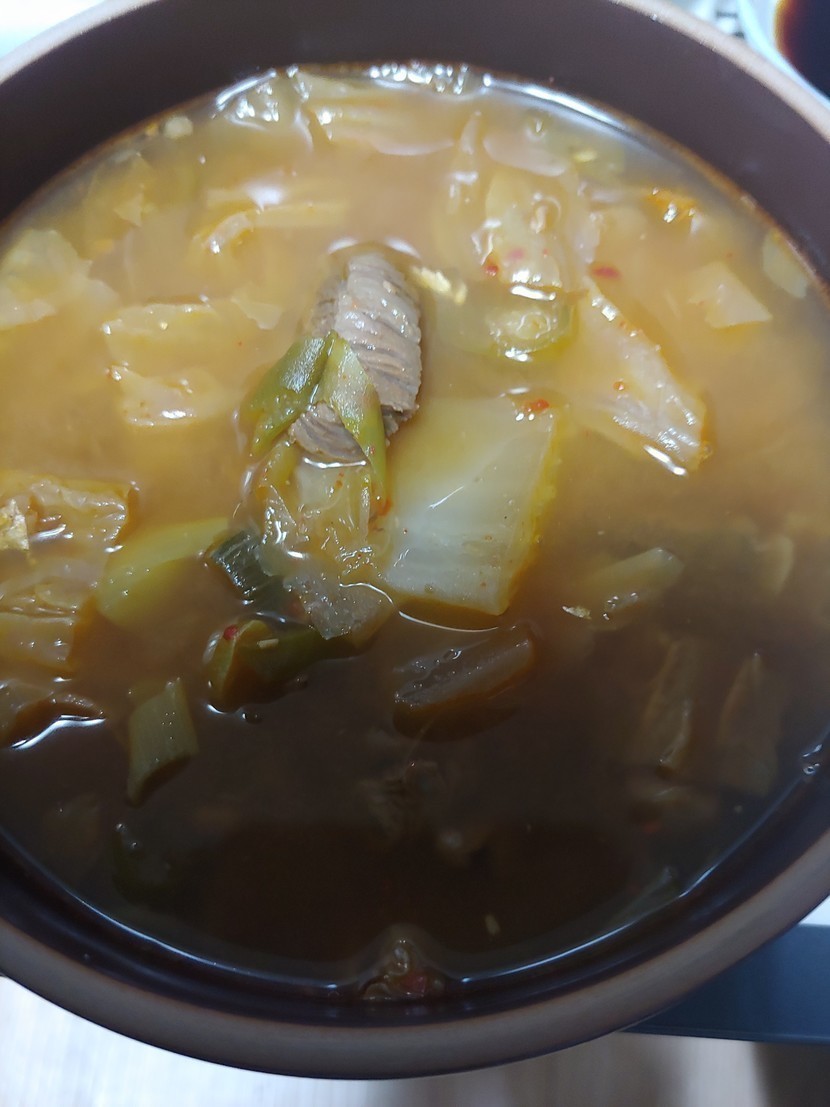 멸치육수에 소고기 300그램과 간마늘1스푼, 된장 3큰술,배추썰으거 넣고 마무리는 소금간 하고 고추가루 로 마무리해서 30분간 은근히 끓여서 간만에 한상 준비합니다..