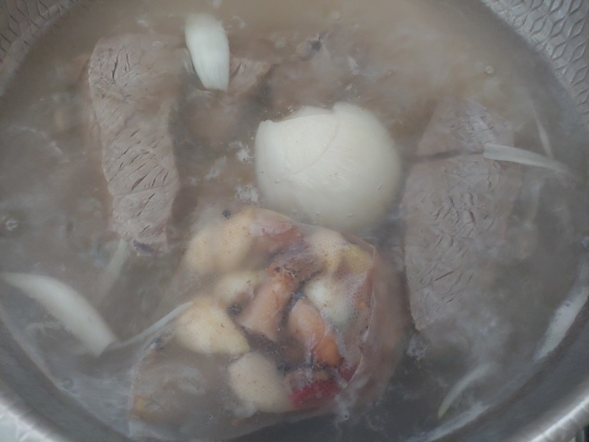 표고믿둥이랑 건고추,통후추,생강반쪽을 티백에 넣어서 핏물뺀 고기랑양파넣고 1시간정도 끓여놓고