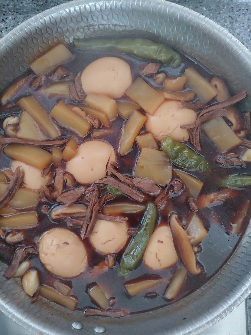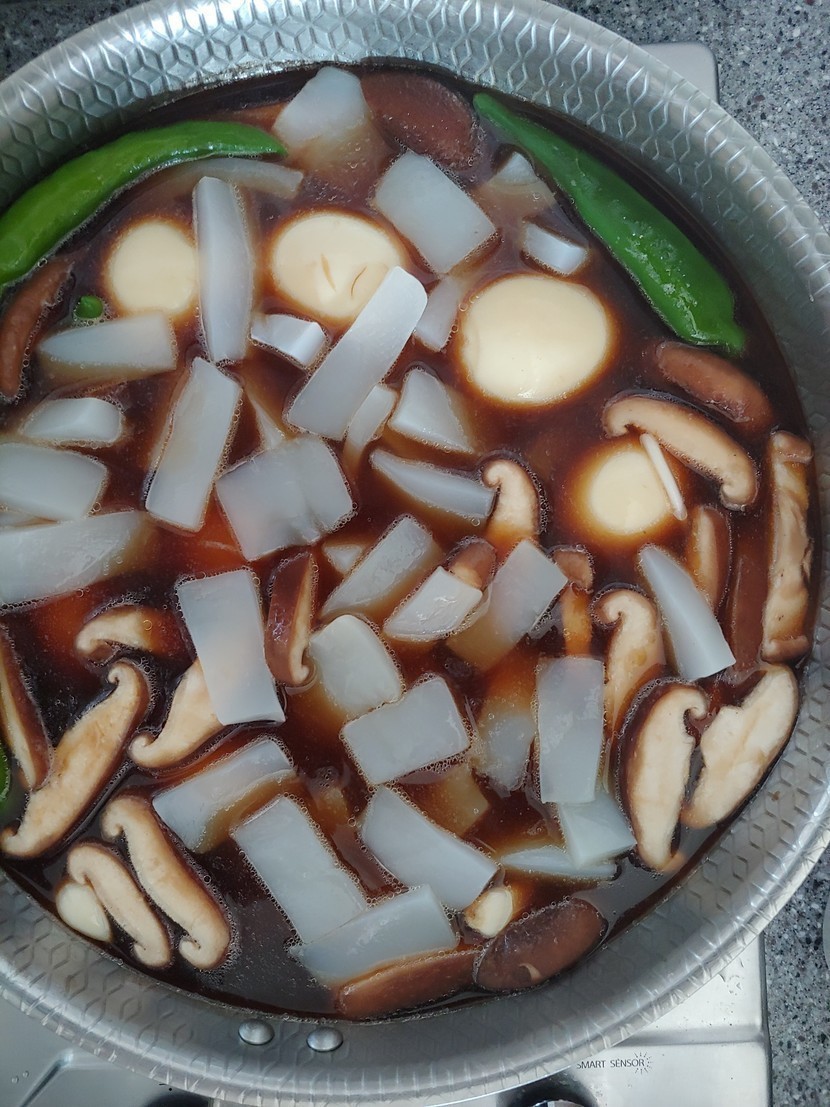 삶은 육수에 삶은계란이랑 미리준비해놓은 재료 투하해서 진간장 1컵,설탕5스푼,물엿5스푼,맛술3스푼 넣고 뚜껑덮어 15분간 은근히 끓이완성 조금 모자랑간은 가감하면 되지요^^~