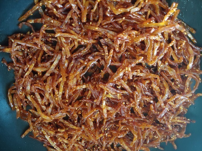 약념은 약불에 고추장 3스푼,물엿3스푼,맛술1스푼,진간장반스푼넣어 살짝 졸인거에 쥐포 넣어 볶아 통깨로 마무리하고