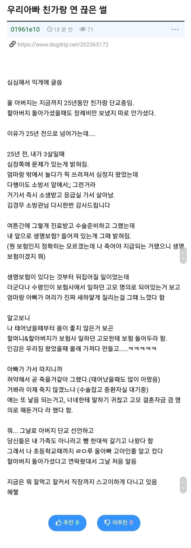19.08.24 480 읽음 우리아빠가 친가랑 인연 끊은 썰.ssul 아이스망고 구독하기 0 1 콘텐츠의 수익 0 ㄷㄷㄷ와 이정도면 인연 끊는 걸로도 화가 안풀릴듯... 1 0 / 300 입력