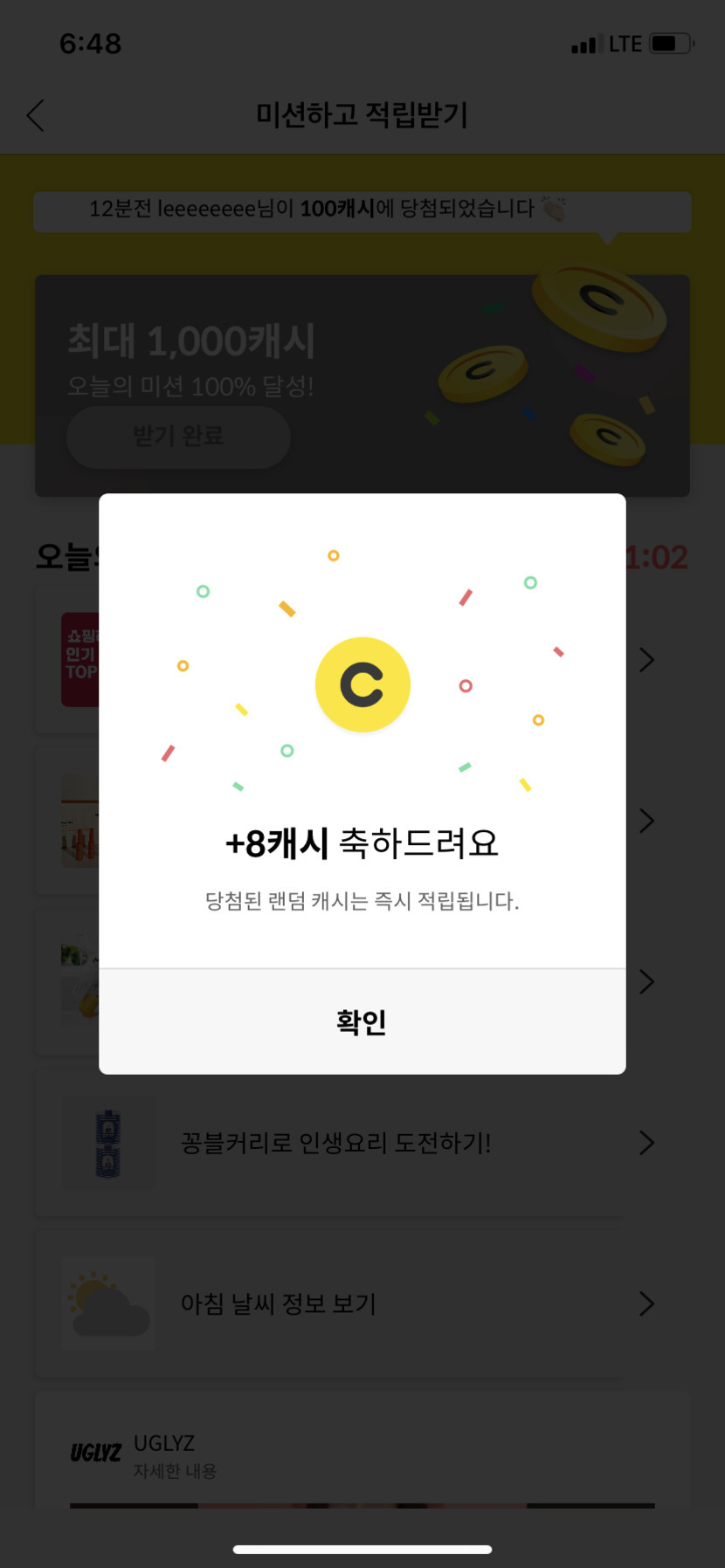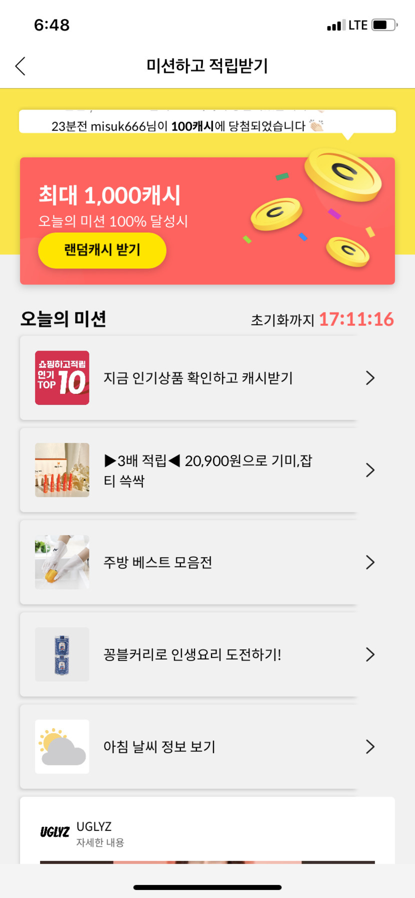 캐시슬라이드 오늘 미션 완료!!