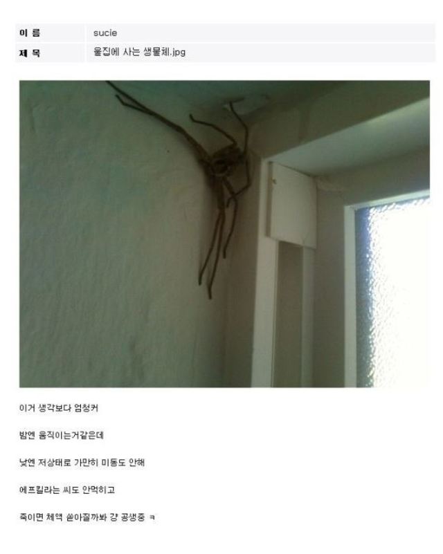 19.08.28 346 읽음 농발거미를 생포해야 하는 이유.twt 9mId0L 구독하기 1 0 콘텐츠의 수익 0 참고로 이렇게 생김((((((((((거미사진주의))))))))))) 0 0 / 300 입력