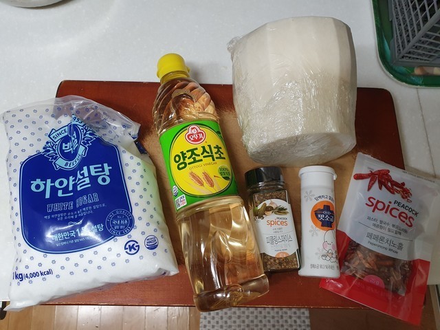 식초, 설탕, 소금, 피클링 스파이스를 준비해주세요