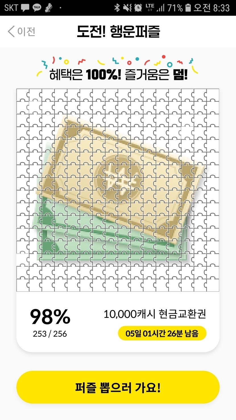 21.02.18 67 읽음 [미션] 미션용 업로드입니다. 파란1000장 구독하기 3 3 콘텐츠의 수익 5 8시에 3조각 남았다가...9시에 드뎌 100퍼 완료 했네요.이제 캐시 10,000원 만들기만 하면...가끔씩 커피 한잔값 벌어갑니다. ^^ 3 0 / 300 입력