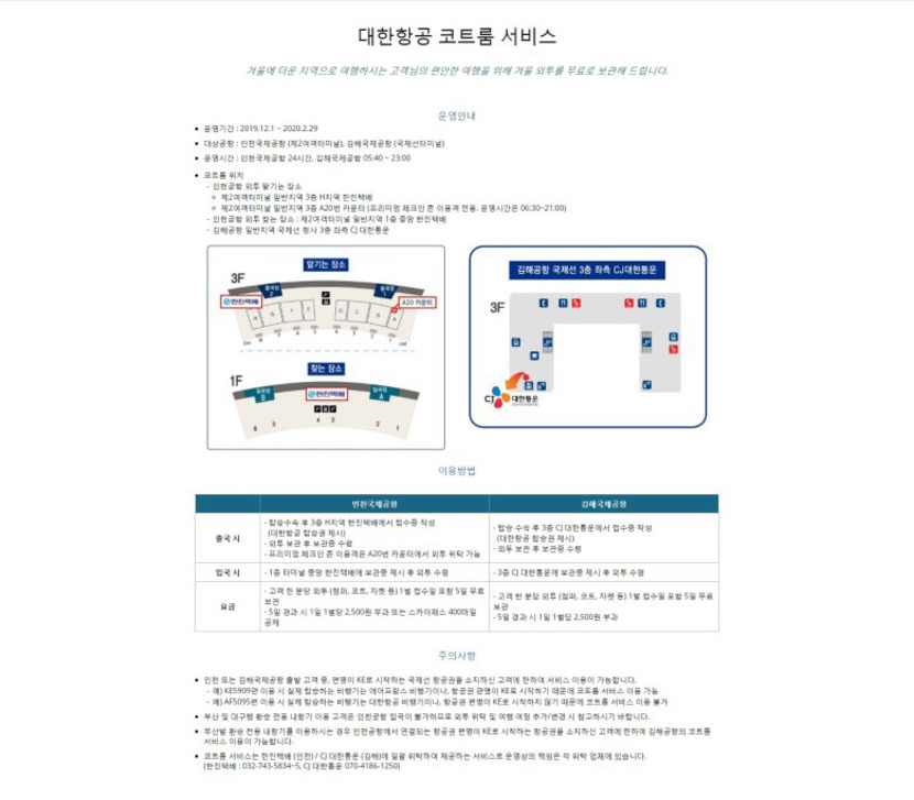 매년 국내 FSC(대한항공과, 아시아나항공)은 겨울철 더운 나라를 방문하는 여행객을 위해 외투보관 서비스를 제공하고 있습니다. --------- [대한항공] 대상 : 대한항공 국제선 탑승객(편명이 KE로 시작하는 항공권 소지고객, 내항기 탑승객 불가) 요금 : 접수일 포함 5일간 1인당 외투 1벌 무료보관(5일 이후는 1일당 2,500원 또는 마일리지 400마일 공제) 출국 시(인천공항) : 제2여객터미널 일반지역 3층 H지역 한진택배(24시간 운영) 제2여객터미널 일반지역 3층 A20번 카운터 (프리미엄 체크인 존 이용객 전용. 운영시간은 06:30~21:00) 입국 시(인천공항) : 인천공항 외투 찾는 장소 : 제2여객터미널 일반지역 1층 중앙 한진택배(24시간 운영) 출입국 시 (김해공항) : 김해공항 일반지역 국제선 청사 3층 좌측 CJ 대한통운(운영시간 05:40 ~ 23:00 ) --------- [아시아나항공] 대상 : 아시아나항공 국제선 탑승객(아시아나 공동운항편 탑승객 이용불가) 요금 : 접수일 포함 5일간 1인당 외투 1벌 무료보관(5일 이후는 1일당 2,000원) 출국 시(인천공항) : 제1여객터미널 일반지역 지하 1층 서편 올리브영 옆 클린업에어(24시간 운영) 입국 시(인천공항) : 출국시와 상동 -------- 매년 12월 1일부터 그 다음해 2월말까지 가능하오니 필요하신분은 무료로 이용하시면 좋으실 것 같습니다. 참고로 아시아나도 매년 시행했던 정책이지만 홈페이지상에 반영이 되어있지않아 확인이 어려우므로 카운터 체크인 시 문의해보시는게 좋을 것 같습니다.