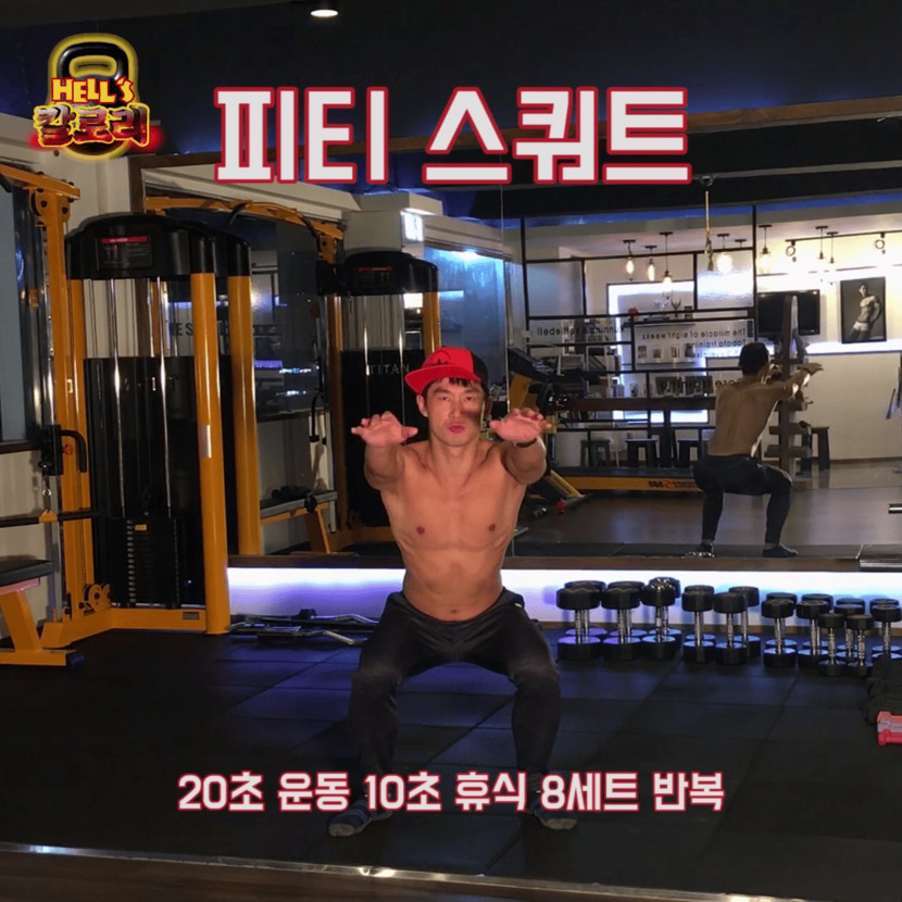 STEP 2. 팔벌려 뛰기 1회가 끝난 후 바로 팔을 앞으로 뻗고 스쿼트를 한다.