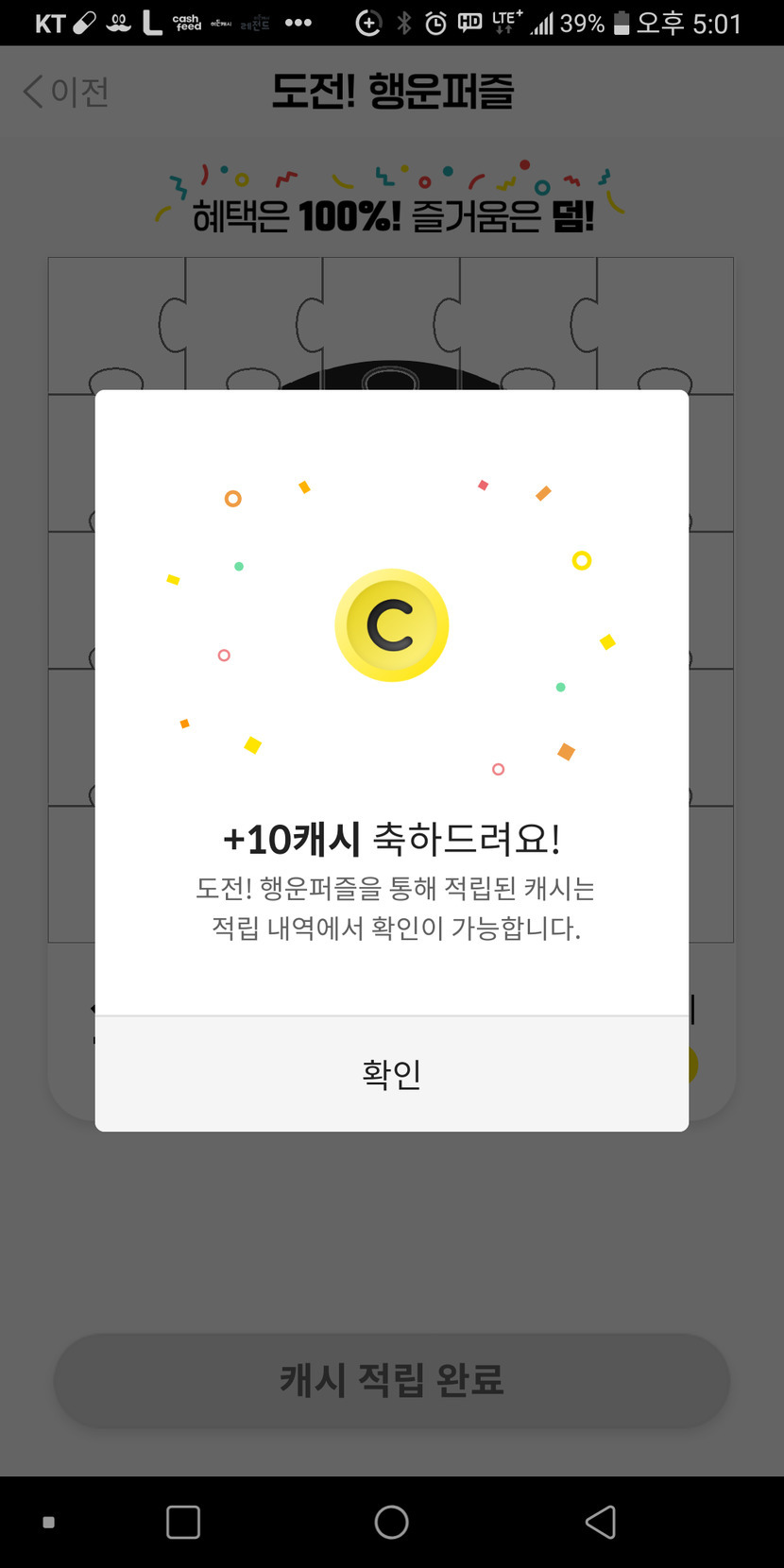 21.05.31 171 읽음 행운퍼즐(100캐시,20캐시,10캐시) 완성!! swsion1078 구독하기 27 28 콘텐츠의 수익 5 오늘은 100캐시,20캐시,10캐시 퍼즐완성 성공했어요. 28 0 / 300 입력