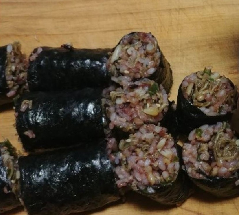 김에 밥을 깔고 만들어놓은 청양고추멸치조림을 넣어서 돌돌 말아주면 완성!!^^