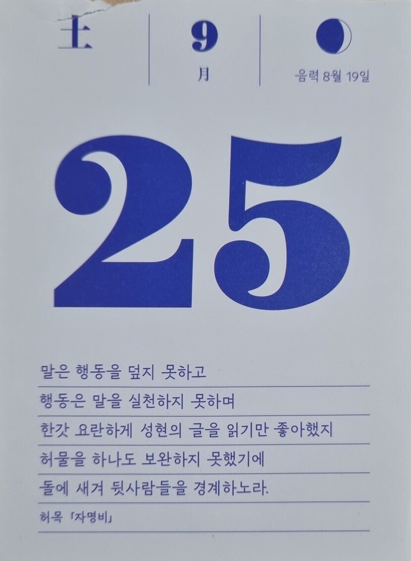 21.09.25 104 읽음 자명비 unD_ 구독하기 4 5 콘텐츠의 수익 4 말은 행동을 덮지 못하고행동은 말을 실천하지 못하며한갓 요란하게 성현의 글을 읽기만 좋아했지허물을 하나도 보완하지 못했기에돌에 새겨 뒷사람들을 경계하노라.허목《자명비》 5 0 / 300 입력