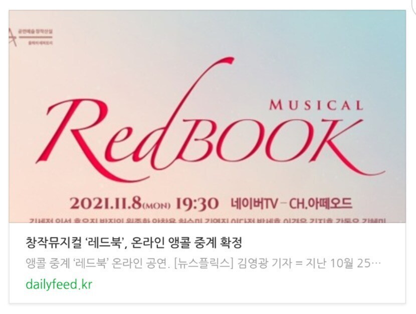 21.11.01 124 읽음 뮤지컬 레드북 온라인 앵콜 중계 11월 1일 오후 2시 티켓 오픈해요. 821101 구독하기 5 8 콘텐츠의 수익 5 창작뮤지컬 ‘레드북’, 온라인 앵콜 중계 확정자세한 정보는 ↓ 기사로 확인해주세요. 🙂https://dailyfeed.kr/7540ce2/163569703212 8 0 / 300 입력