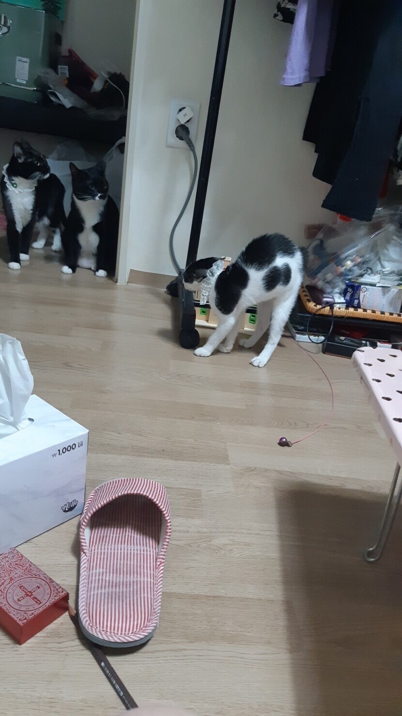 두냥이가 그냥쳡다본건데 싸우는줄알고 털세우네 막내냥이주제에ㅋ