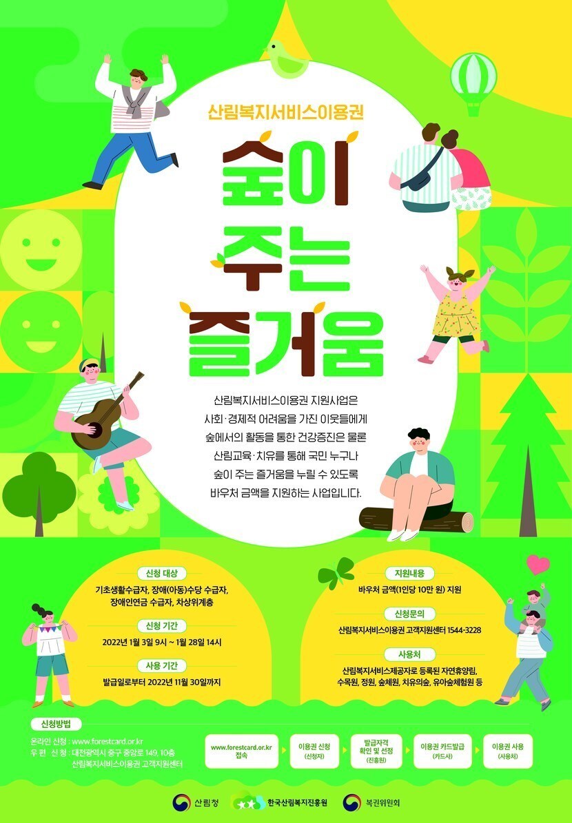 사회·경제적 여건으로 산림복지 혜택을 누리기 어려운 취약계층에게 10만 원 상당의 산림복지서비스이용권을 제공하는 제도 (2022년 5만 명을 선정하여 지원)