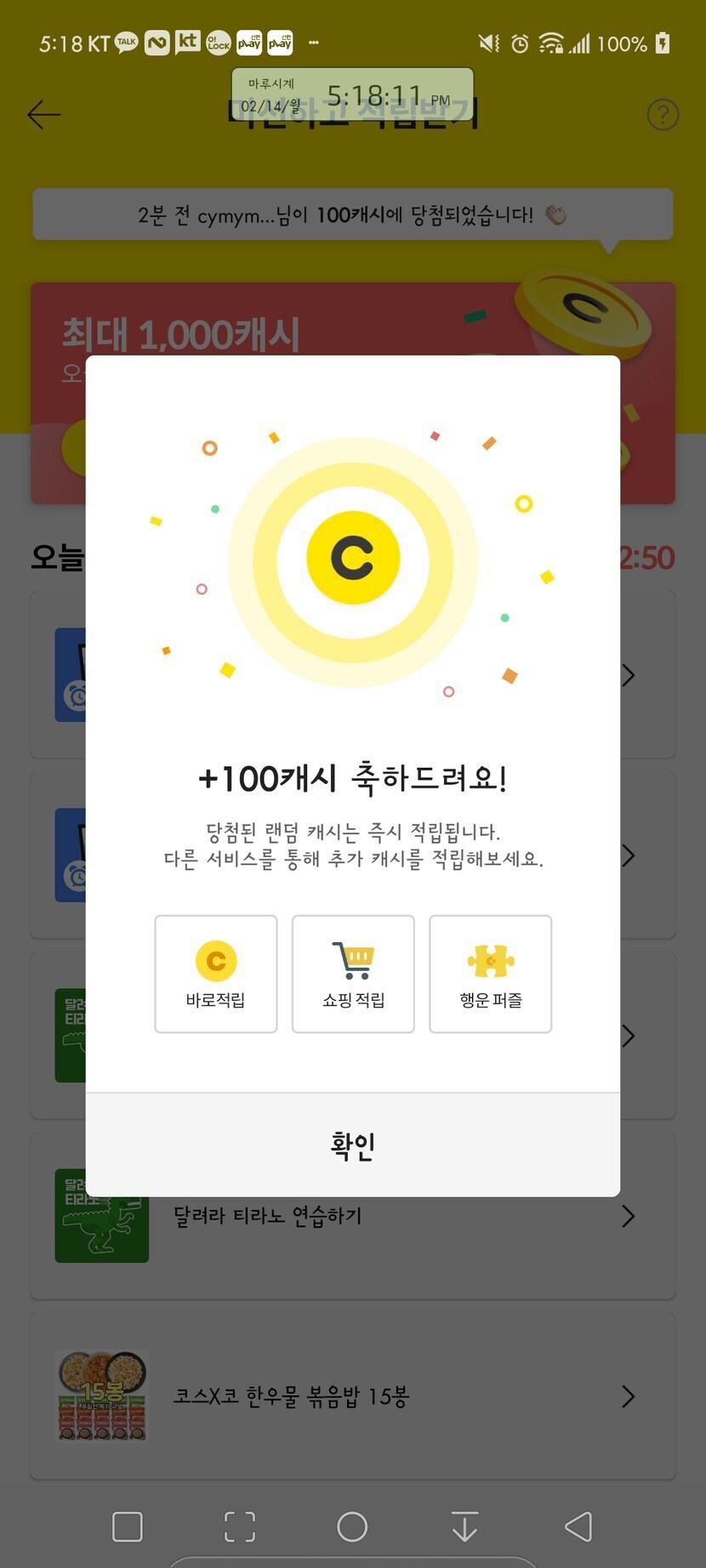 미션적립에서 100캐시 받았어요~~