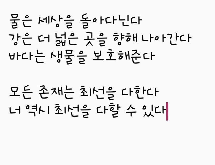 22.03.24 31 읽음 두번째 시 ctg36790 구독하기 0 0 콘텐츠의 수익 1 물은 세상을 돌아다닌다강은 더 넓은 곳을 향해 나아간다바다는 생물을 보호해준다모든 존재는 최선을 다한다너 역시 최선을 다할 수 있다 0 0 / 300 입력