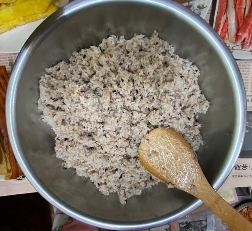 8.밥에 참깨와 소금,참기름을 넣고 섞어주세요~!
