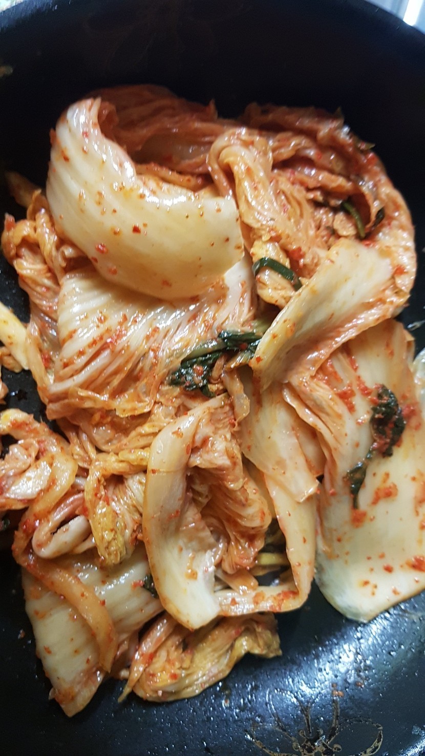 5.묶은지의 국물을 짠후 참기름을 넣어 버무려줍니다.