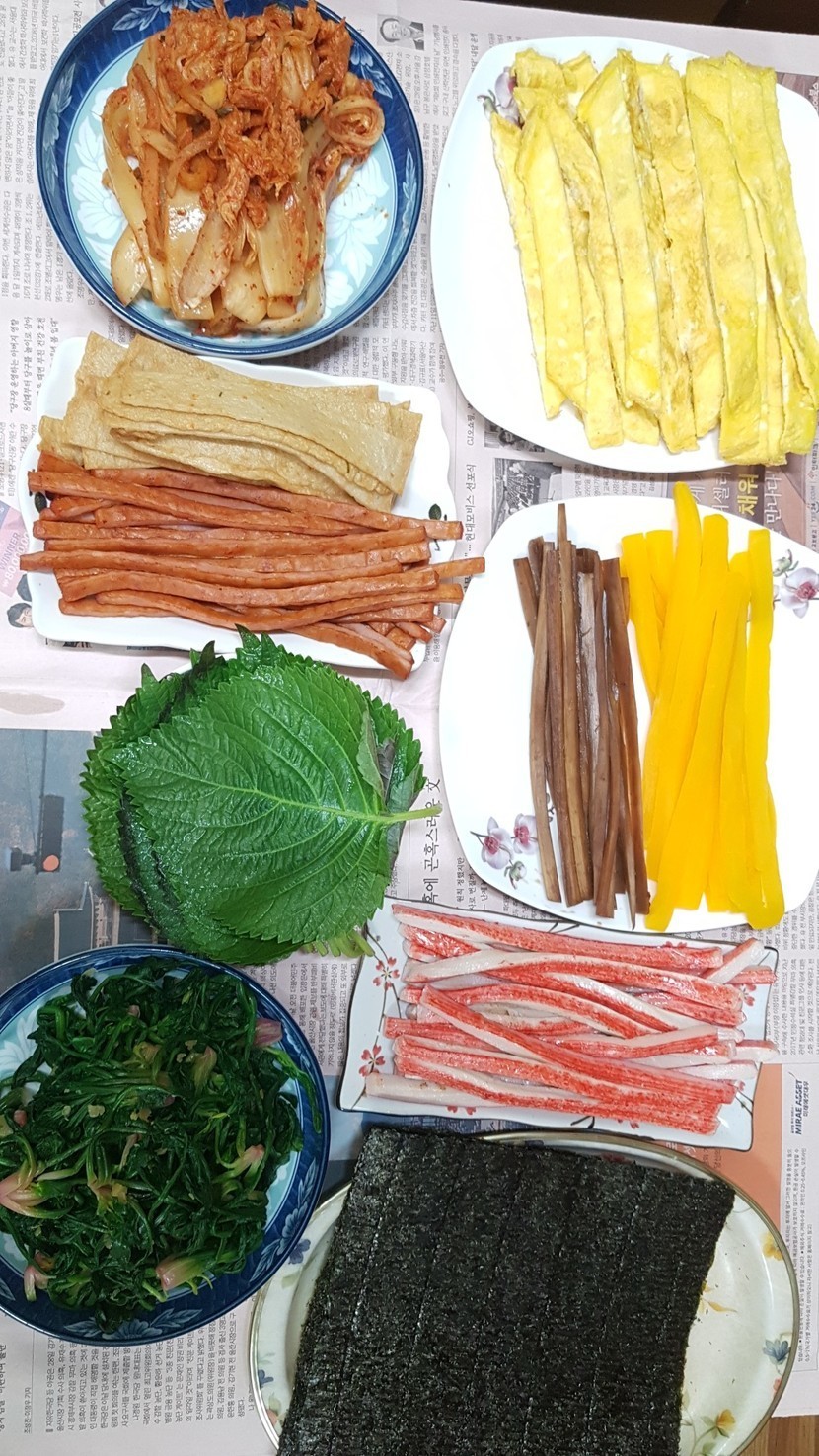 저번에 엄마 드시라고 싸드렸었는데 너무 좋아하셔서 또 싸다드릴려고 합니당~~재료:어묵,맛살,시금치,햄,단무지,우엉,묶은지,참기름,밥,참깨,소금,구운김