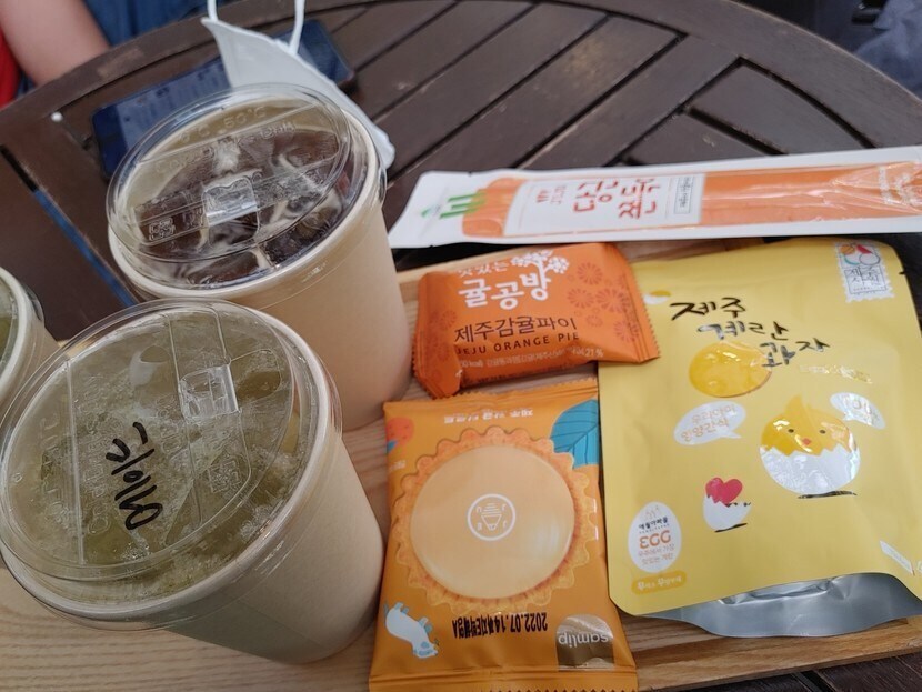 저는 제주 계란 과자 불 공방 제주감귤파이 당근 쪽쪽이 에이드를 시켰습니다