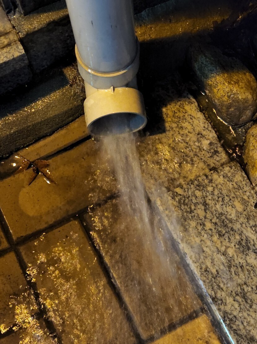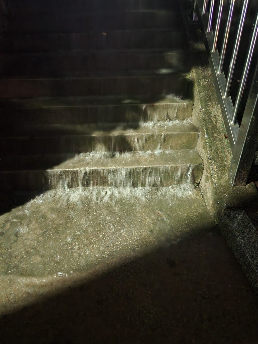 아파트 계단에 쏟애는 빗물이나