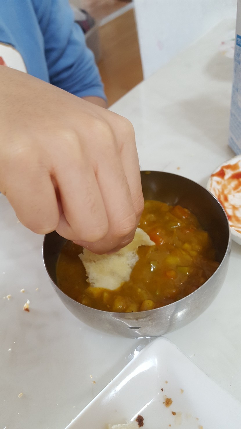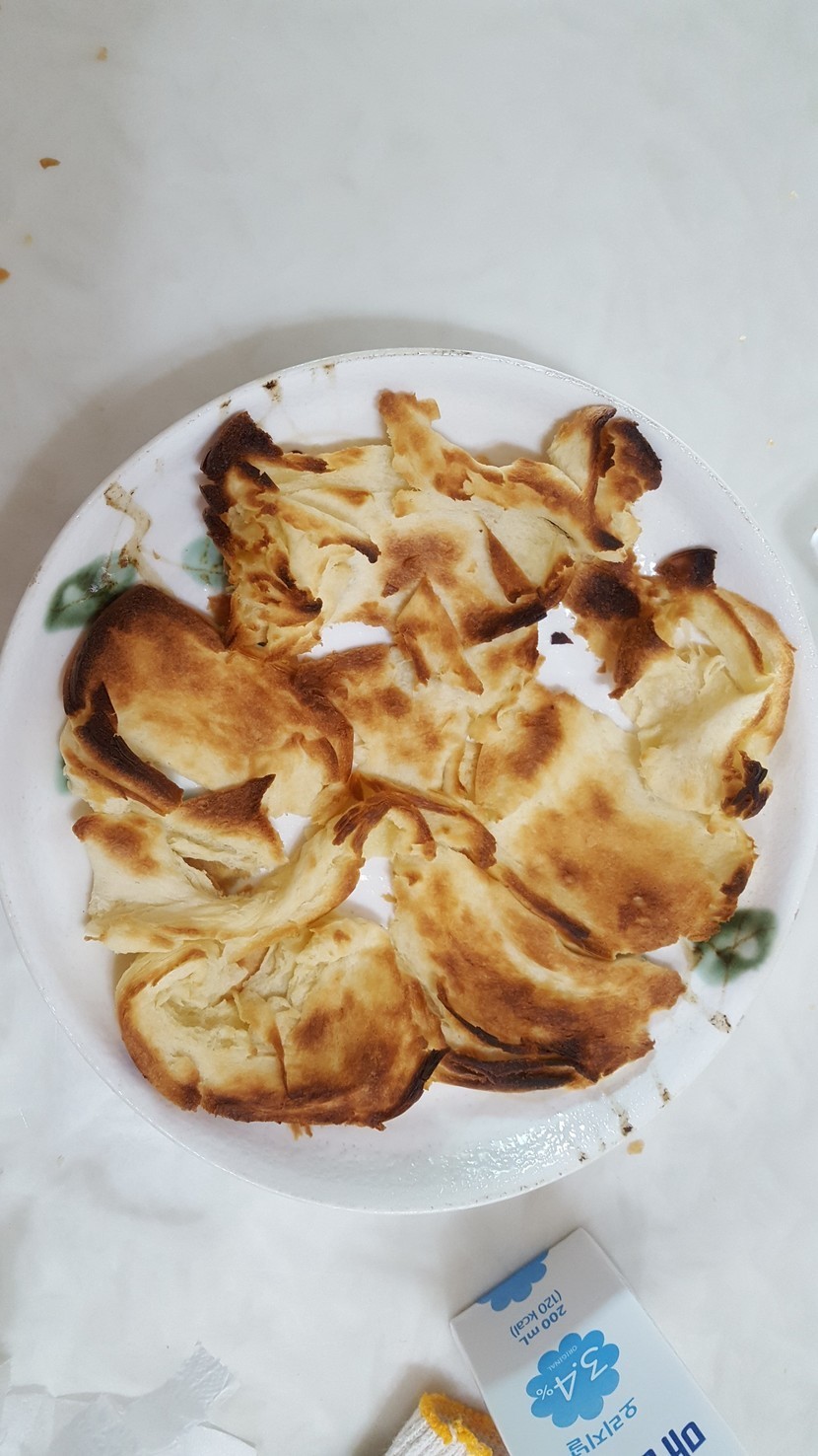 바삭한 부분부터 먹다 보니 촉촉한 속이 남아 있네요. 덜 익은 건 아닌데 그런 느낌이 들기도 하고 바삭하게 마무리하고 싶어 식빵 잔해를 다시 오븐에 넣었습니다. 온도 조절, 시간 조절 실패.... 태웠네요^^;; 아이들이 인도음식점에 갔을 때 '난' 같다며 냉장고에 있던 카레를 들고 와 찍어 먹습니다. 물론 탄 부분은 떼어내고요~