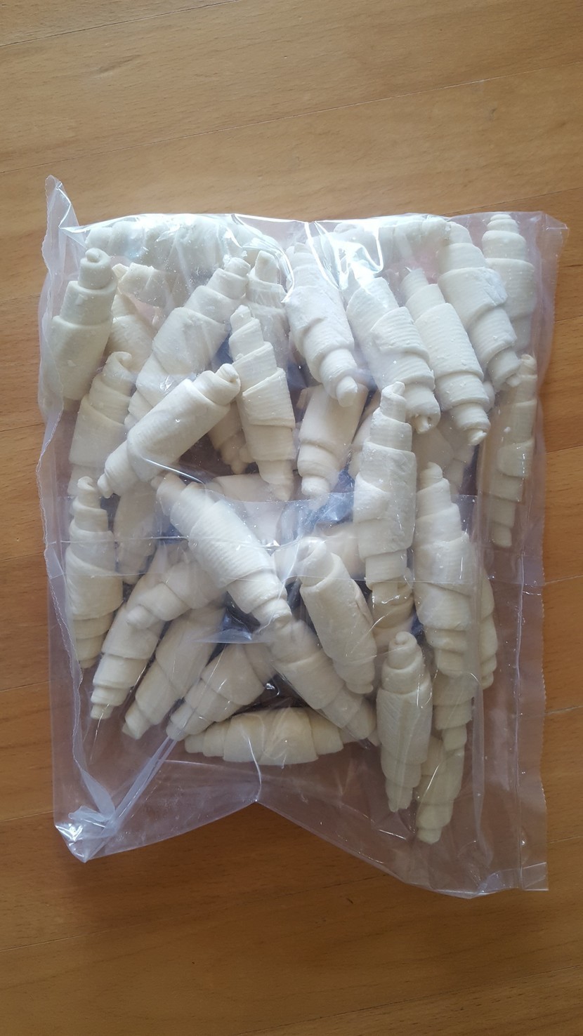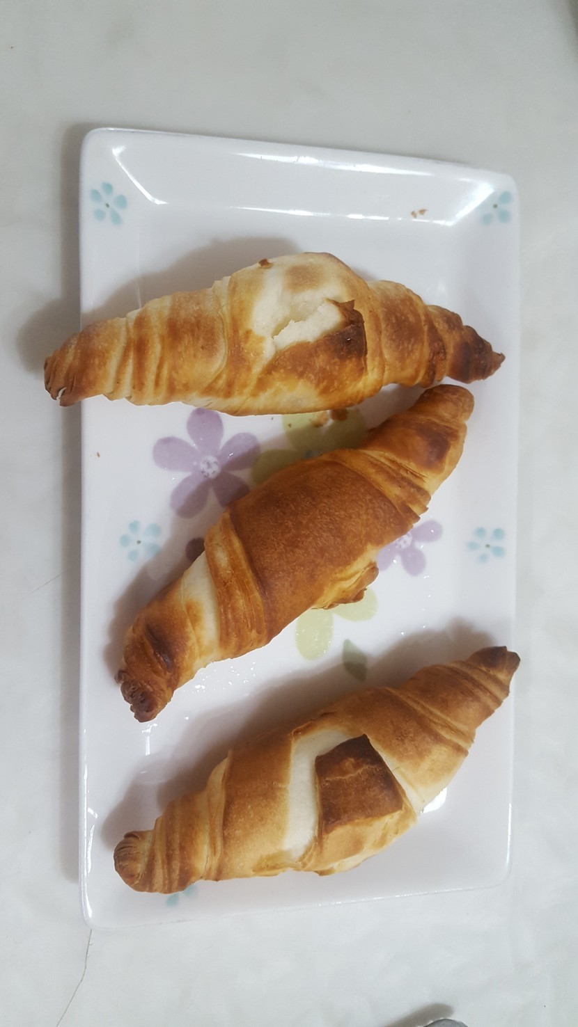 함께 시켰던 크로와상 생지는 재고 부족으로 어제 도착했어요. 이번에는 에어프라이어에 구웠어요. 오븐보다 훨씬 빠르게 익는 듯 하네요. 그런데 위는 타고 아래는 늦게 익어서 한번씩 뒤집어줘야해요. 첫번째는 180도에 구웠다가 타서 두번째는 160도에 구웠어요. 시간은 5~10분 정도 걸린 것 같네요. 에어프라이어 용량이 작아서 3개씩밖에 못 구웠어요. 맛도 오븐이 나은 듯? 오븐 있으시면 오븐에 굽는 거추천 드려요~