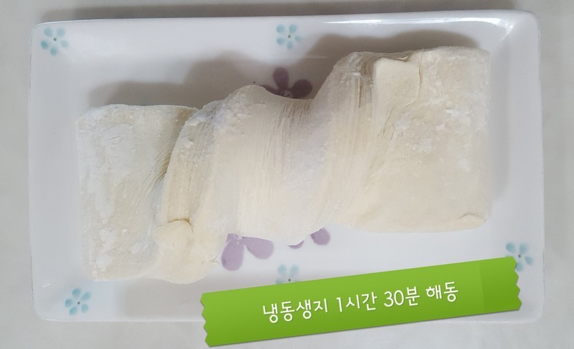 냉동 상태의 생지에게 자연 해동과 숙성의 시간을 줍니다. 저는 오븐을 아주 살짝 데워 전원을 끈 뒤 남아 있는 온기 속에서 숙성을 시켰어요. 귀찮으신 분은 비닐 씌워 실온에 두셔도 될 듯해요.