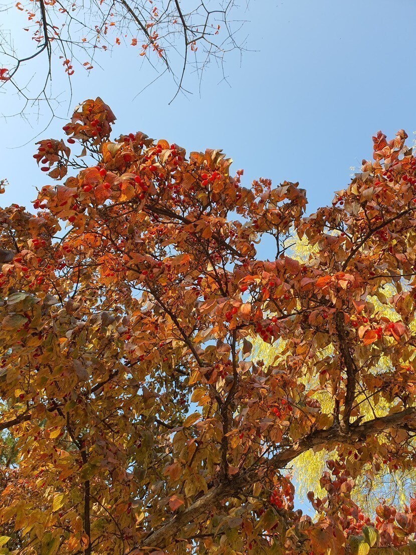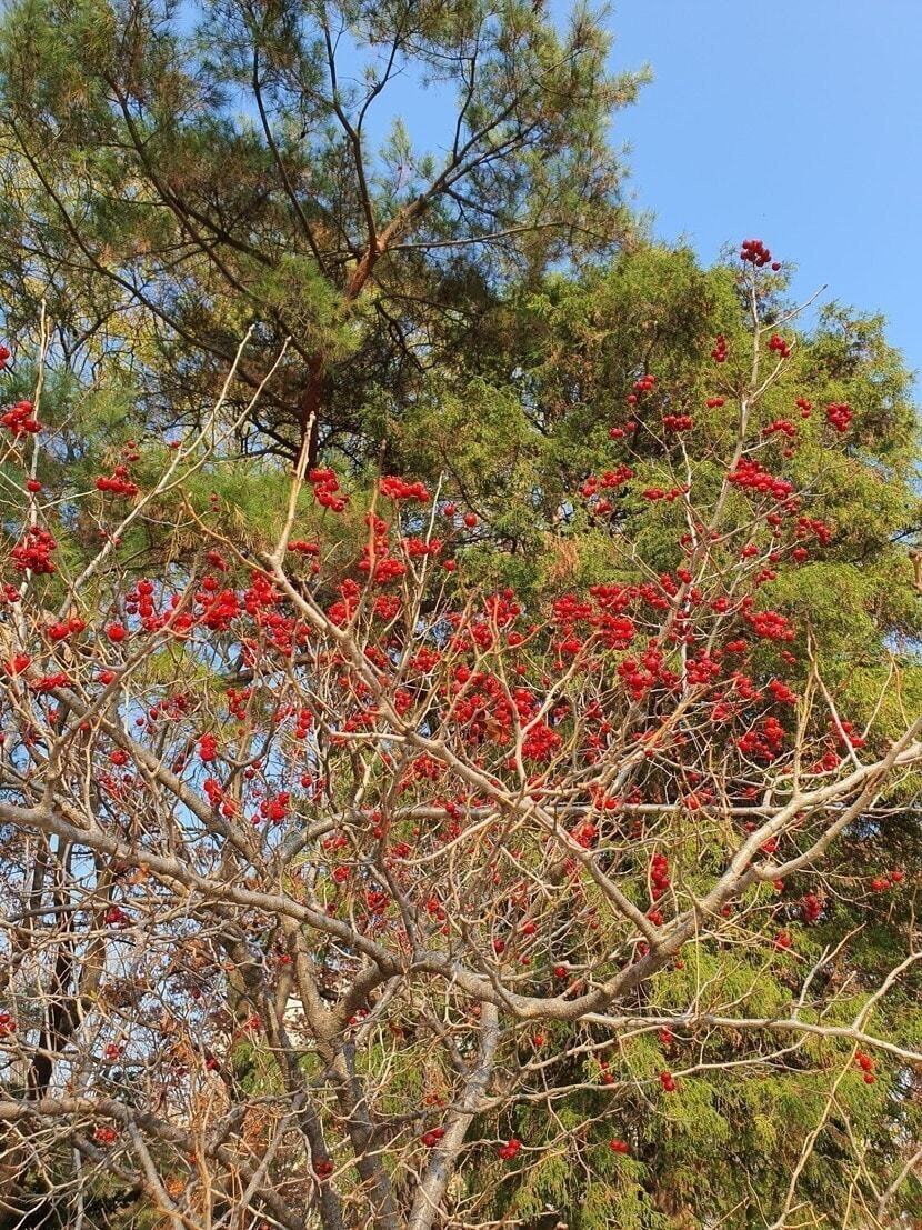 1980년대 초에 심은 듯 아직 젊은 단풍나무, 은행나무, 산수유 열매가 가을을 놓지않고 있어서