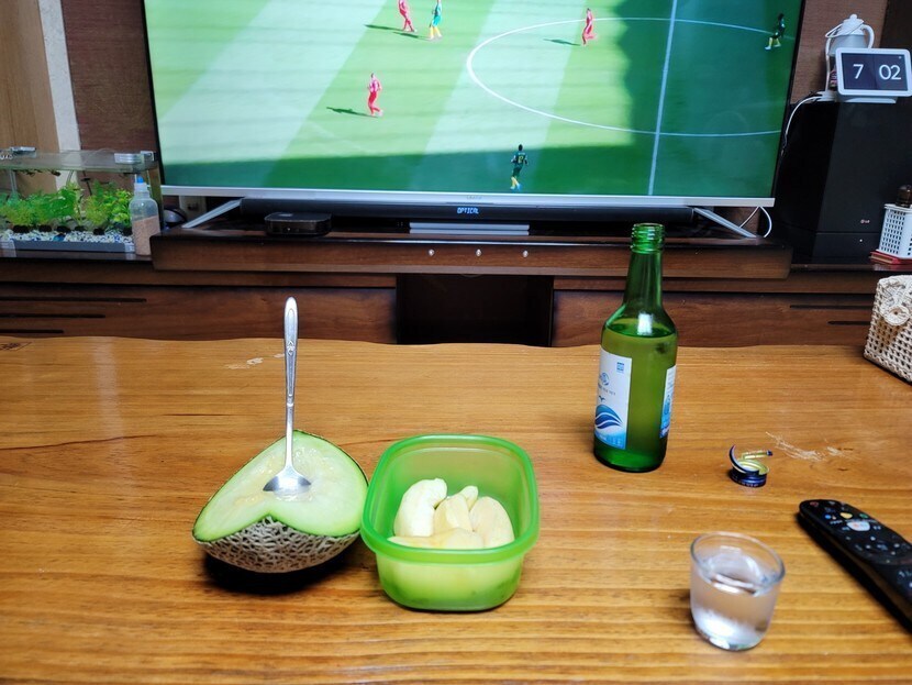 아구찜 받고 메론에 사과 과일 안주에 축구보며ᆢ